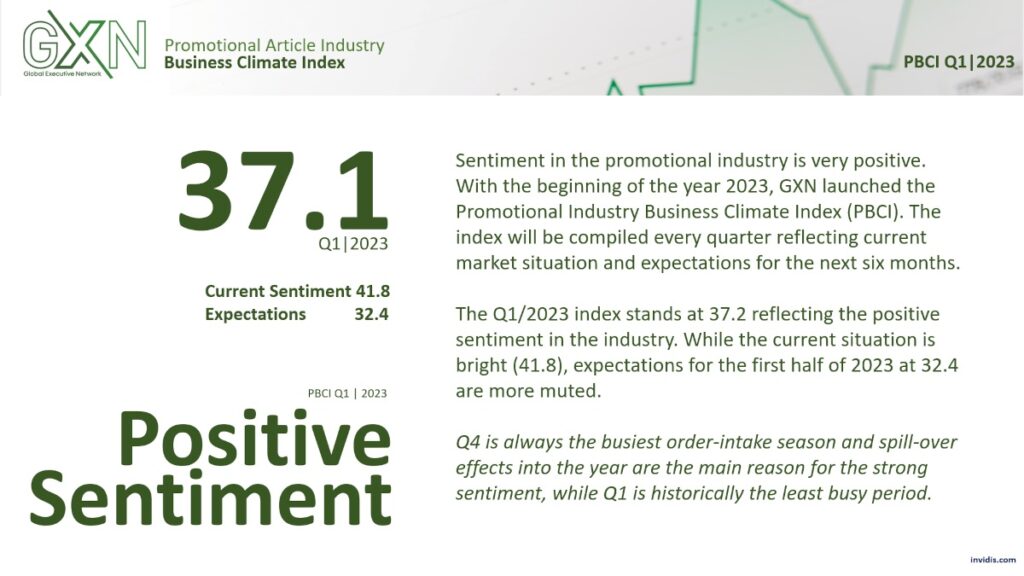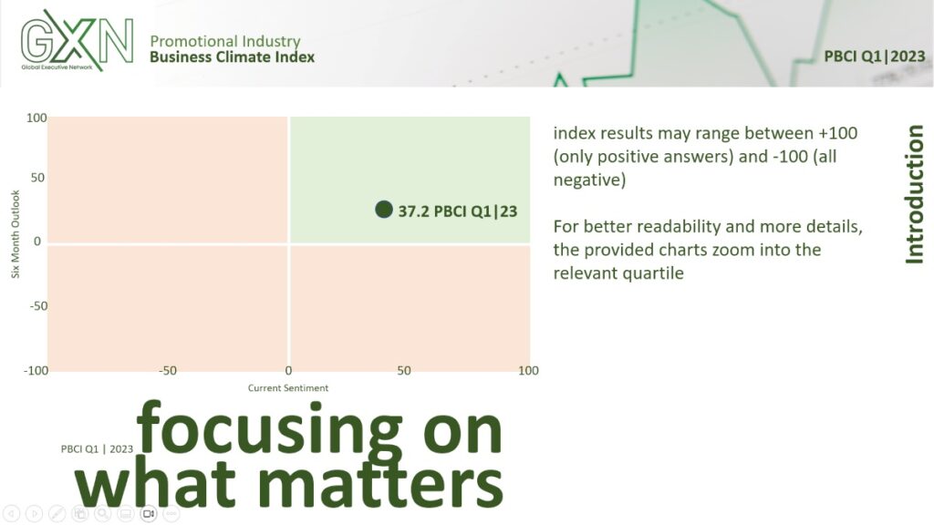 The GXN Business Climate is an early indicator for economic development of the promotional industry. It is based on 300+ quarterly survey responses of market players of the promotional industry market representing 3bn EUR revenue in 2022..